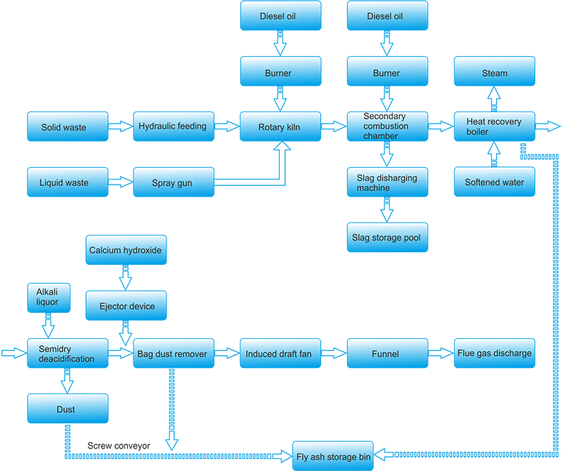 Main incineration equipment: Rotary kiln + secondary combustion chamber + heat recovery boiler + exhaust gas treatment equipment;